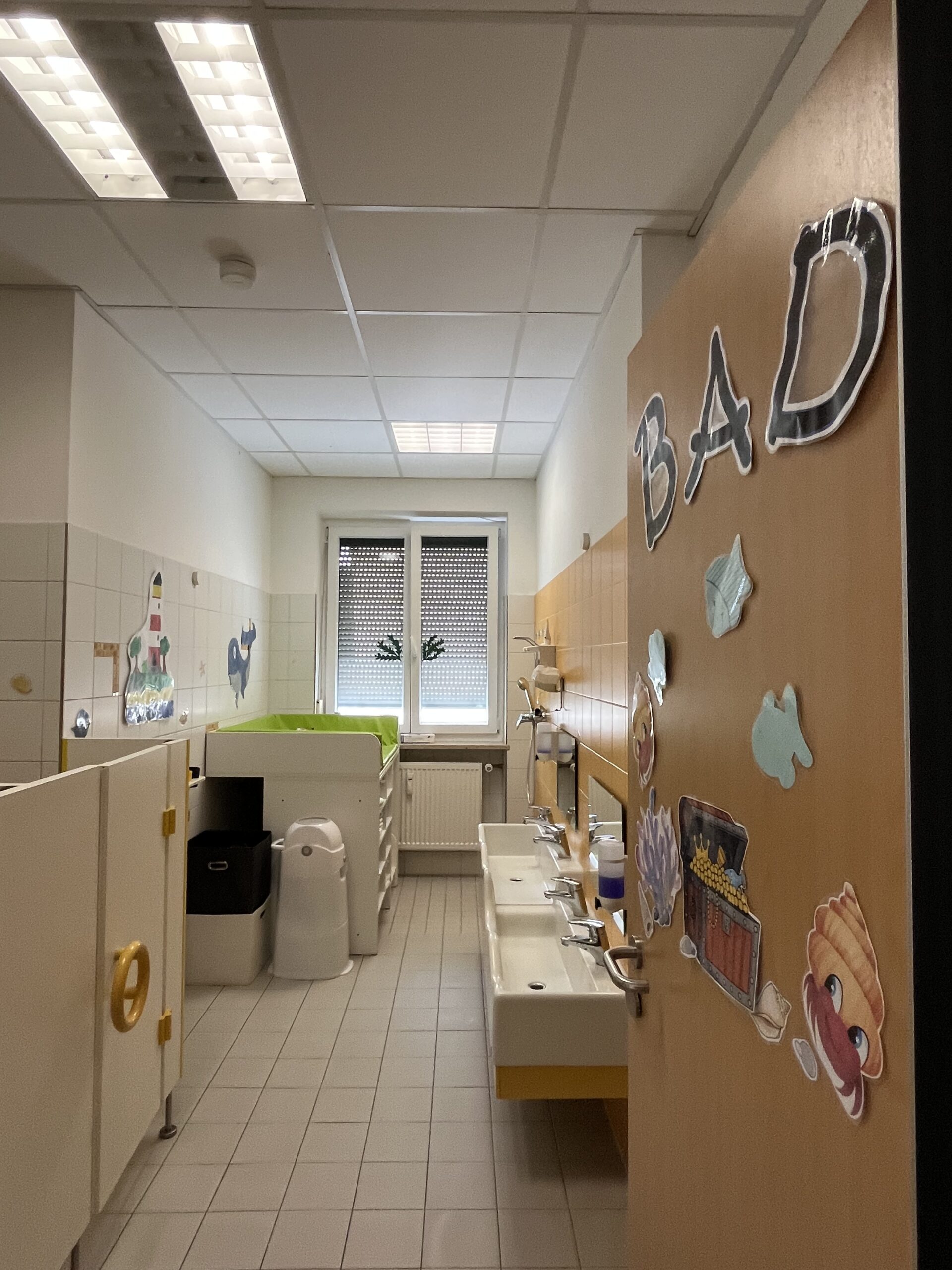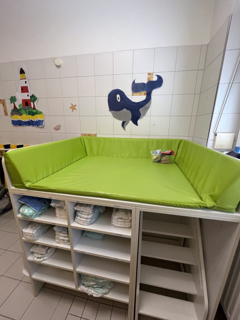 Das Badezimmer ist mit zwei Kindertoiletten, einem Wickeltisch, einer Dusche und einem großem Waschbecken ausgestattet.